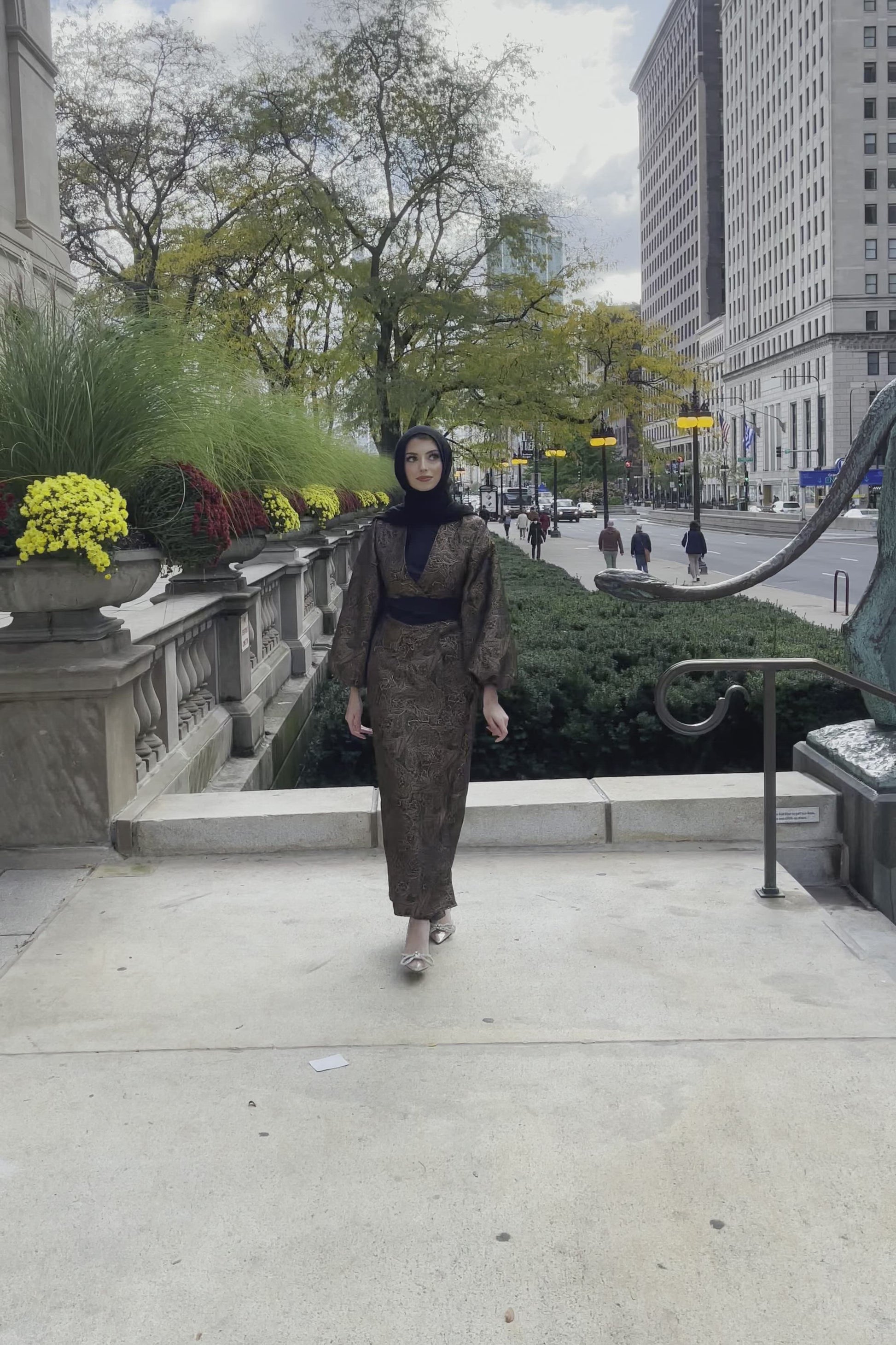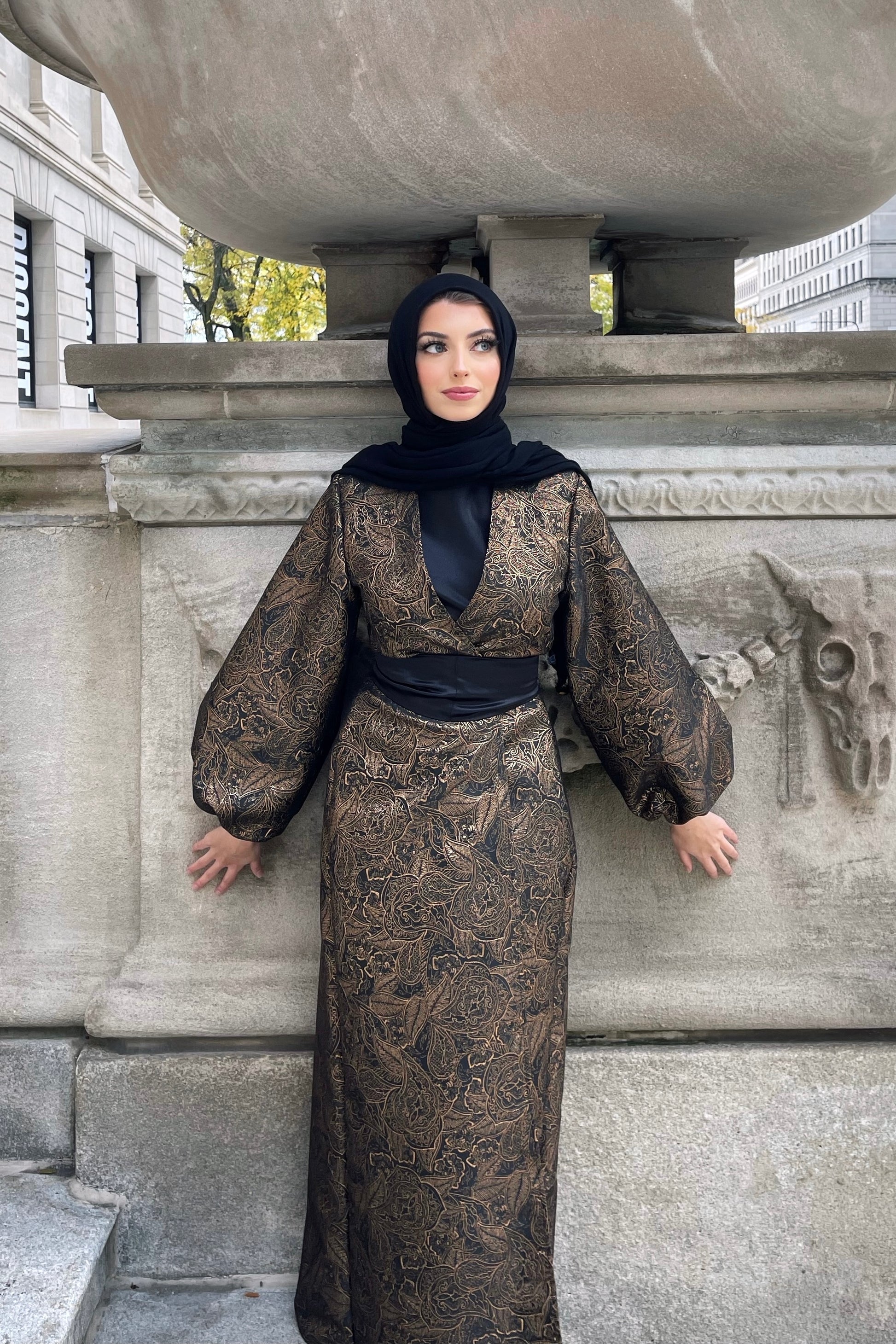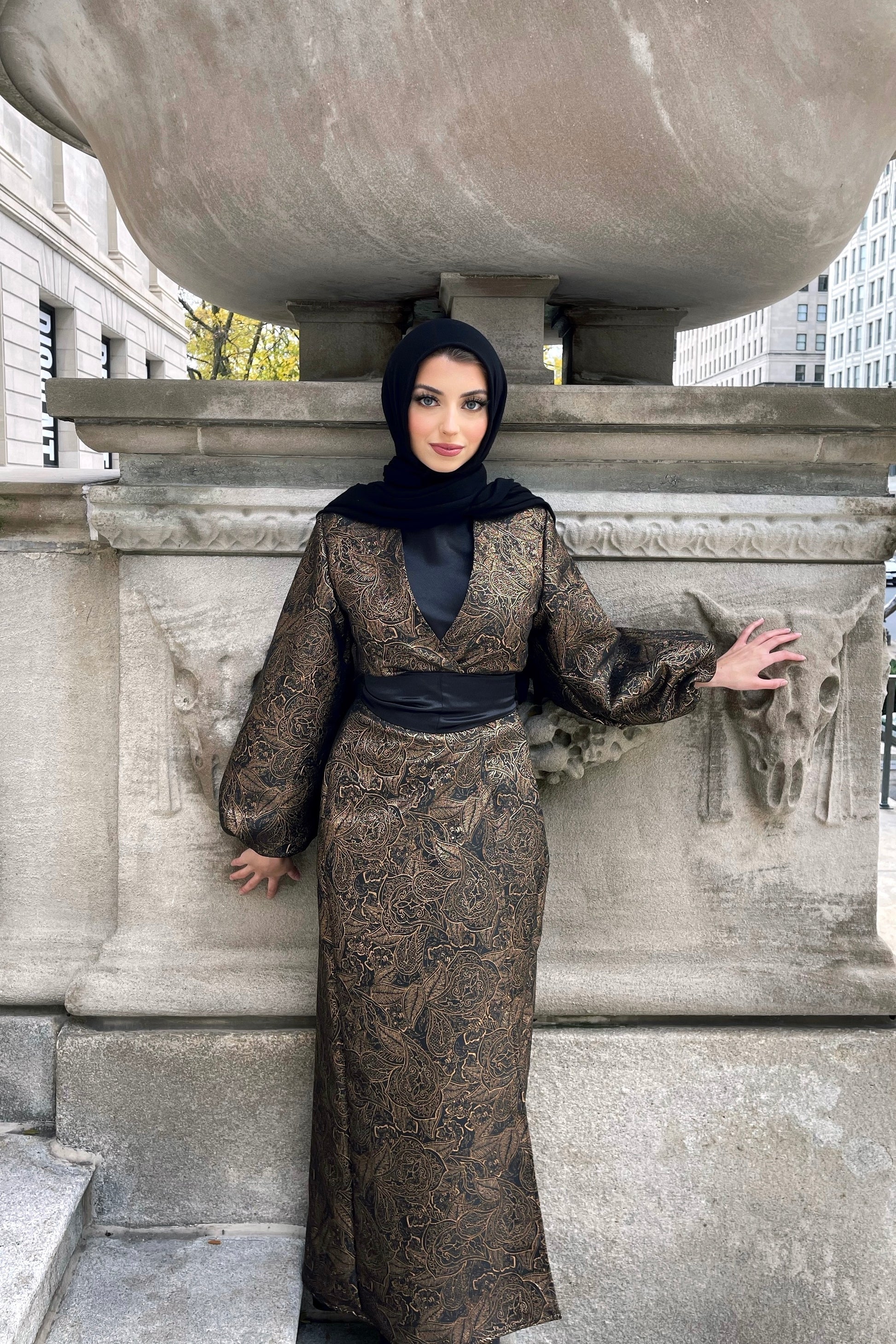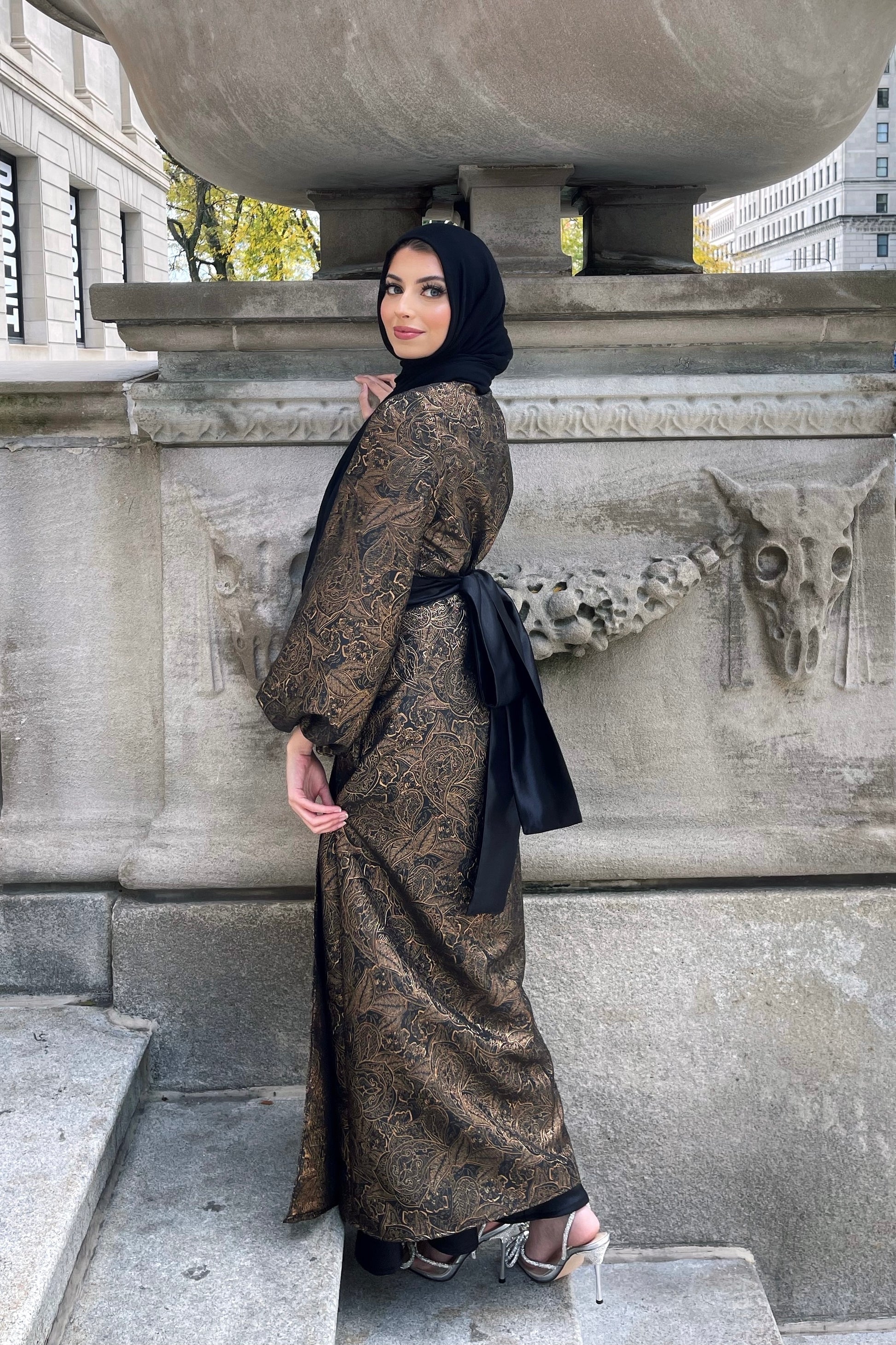 The Enchanted Robe comes in a matte black and metallic gold brocade fabric. It features balloon style sleeves, a wide black satin belt, and is maxi length. This classy statement piece has an intricate floral pattern. Complete the look by pairing it with our Black Bias Maxi Dress (all pieces sold separately).