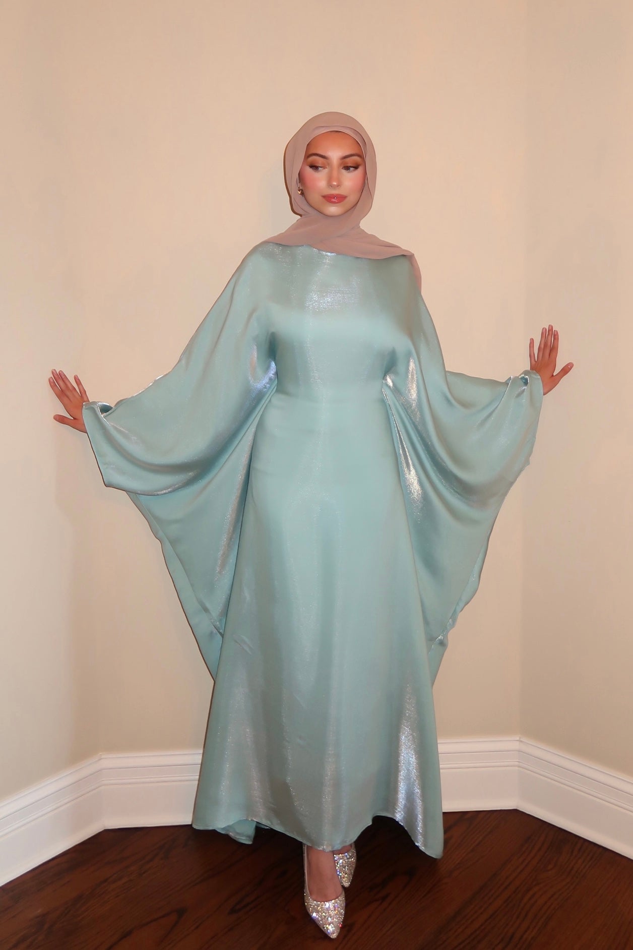 The Turquoise Butterfly Abaya is crafted from an iridescent, lightweight fabric. This piece features a hidden belt inside to create the signature butterfly abaya effect. Its flowing design and delicate shimmer will make you feel effortlessly elegant and confident.